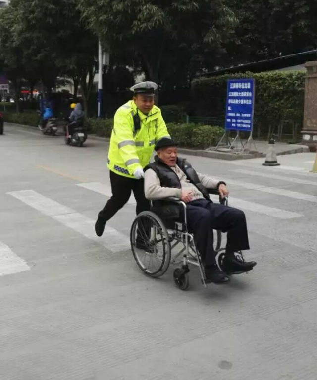 从2月15日开始,每天早上8时许在长洲辖区和信堂路口不少路人都能看得这样暖心的一幕,一位身穿黄色执勤服的交警推着一位老人穿过斑马线直到儒膳房大酒楼门口,直到服务员出来将老人推进酒楼,交警才转身离开,回到自己的工作岗位继续指挥疏导交通。