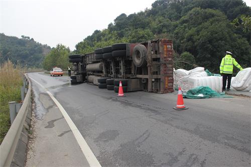 2月18日下午13时42分,梧州交警支队高速一、二整合大队民警接到110警情电话,称在G65包茂高速梧州连线(梧州往南宁方向,梧州连线匝道处)发生一起大货车侧翻事故,同时,有人员受伤。接到警情后,民警马上赶到事故现场。