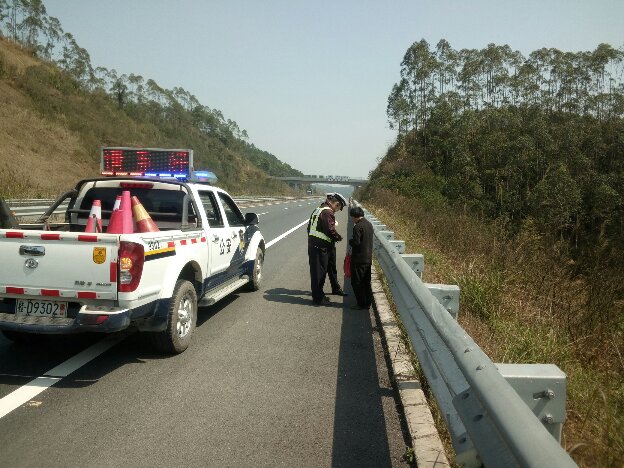 3月1日中午12时许,梧州市公安局交警支队高速四大队民警在处理一起警情返程途中,在S40线苍硕高速梧州段(即贵梧高速)35公里往梧州方向,发现一名男子行走在应急车道上,经了解该男子一路行走国道、高速公路共七天七夜,民警将该男子安全送离高速,并安排一辆客车将其送达目的地。