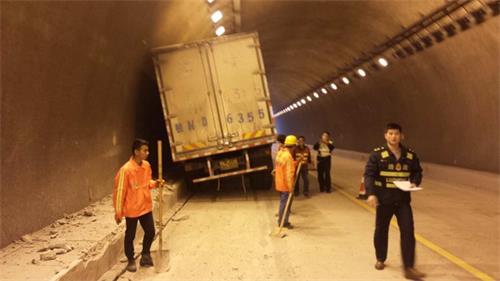 2016年3月4日10时10分许,梧州市交警支队高速三大队接报,在S50线岑罗高速往罗定方向高坡冲隧道内有一辆货车在隧道内发生事故,车辆占用隧道左侧行车道,现场无人员受伤。由于事故发生在隧道内,隧道只得两条车道,事故车辆占用了一条行车道,加上隧道内的光线昏暗等,现场情况比较危急。