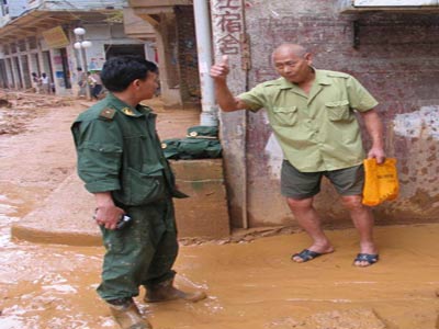 图为:黄继斌(左一)深入抗击洪灾一线采访,得到老百姓的赞扬。