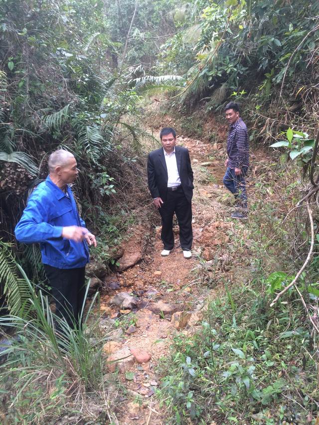 “车只能开到这里,要爬到山上去,刚下过雨,大家小心些。” 道冲村是黄村镇较边远的一个山冲村,一条窄窄村道在大山中穿行,里边是大山,外边是陡崖,车在密林深处的蜿蜒村道爬行,经过一个多小时才来到山冲路口,当事人刘某便叫大家下车步行前往。于是,覃阴伟拿上皮尺及相关案件材料,与干警及当事人一起上山勘验,窄窄的草间小道,不时还被溪水漫过,大家小心翼翼行进着。