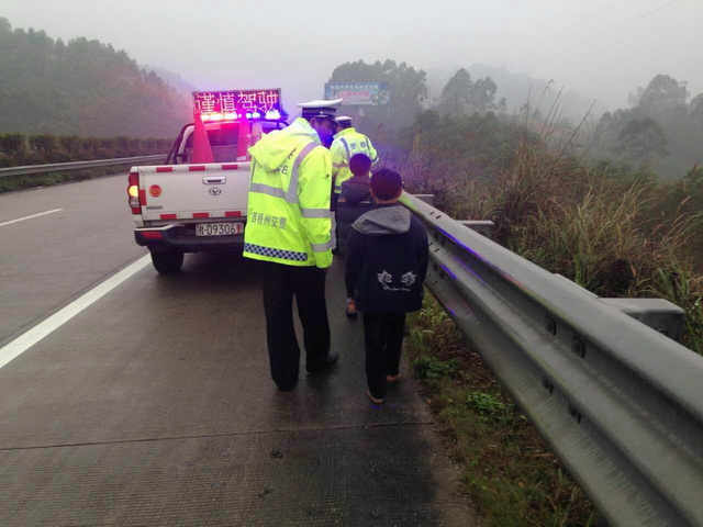 2016年3月16日下午,下着小雨,梧州市交警支队高速公路管理三大队民警李健康带领着协警正在辖区高速公路上执行巡逻任务。当巡逻至S50线岑罗高速往南宁方向12KM(归义镇附近)处,发现了两名小孩正在应急车道上行走。民警李健康意识到其中的安全隐患,于是马上停车下来,在不惊到他们的同时慢慢接近他们。靠近后发现两个小孩一个穿着拖鞋、一个光着脚丫,天气这么冷,又下着雨,于是民警赶紧把他们叫到警车上坐着,并开暖气给他们暖身子。在车上民警细声询问他们,“叫什么名字、哪里人、在哪里读书”,好赶紧送他们回到家。刚开始他们模糊回答说是归义镇附近的人,一时贪玩迷路走上了高速。于是民警就搭着他们从归义收费站出口下了高速,带他们到某村中,但是经与该村村民了解得知,他们俩不是本村人口。后来,民警再次耐心询问两名小孩,才得知他们是在岑溪长坡小学读书,长坡人,距离归义有三十多公里。于是民警通过查询,联系到了长坡小学的校长,经核对确认这两名孩子是他们学校的学生,并通知了班主任和家长。为了确保万无一失,大队民警将两名小孩送由当地派出所,让家长到派出所去接领他们。