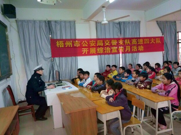 为深入贯彻落实党的十八大和十八届三中全会精神、四中全会精神,不断深化平安梧州建设和社会综合治理工作,根据《梧州市社会管理综合治理委员会关于开展2016年综治宣传月活动的通知》(梧综发[2016]1号)和《梧州市公安局交警支队2016年综治宣传月活动方案》梧公交管〔2016〕18号文件要求,高速四大队于3月17日到辖区藤县礼秀村礼秀小学开展综治宣传活动。