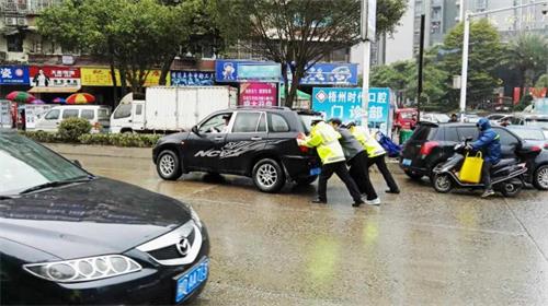 经过了协警和车主的努力终于将故障车辆推到了路边,而道路交通指挥也在民警的指挥疏导下恢复了畅通,出行的驾驶员和行人又重新踏上了出行的路程。此时的民警和协警的警服早已被汗水浸透,脸庞也被雨水打湿,但高效、快速的处置让过往的不少驾驶员们为他们竖起了大拇指赞道“长洲交警好样的!”
