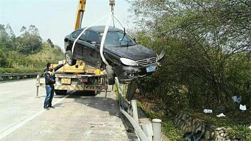 2月20日中午12时,梧州市交警支队高速一、二整合大队民警在G65包茂高速辖区路段巡逻时,发现在包茂高速2803KM处(梧州往南宁方向)一辆挂着本地车牌的小车撞到了护栏,并导致车辆前轮陷进去了排水沟,车辆后面的一只轮也滚到了路面上,旁边没有做任何安全防护措施。