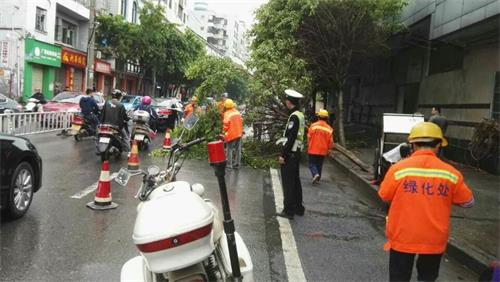 4月13日凌晨,梧州遭受雷电、大风、暴雨强对流天气袭击,导致西堤一路防汛抗旱指挥部对出路段的一棵路树被大风刮倒。树木断枝占据了半幅车道,严重影响道路的正常通行。事情发生后,万秀交警大队迅速启动应急预案,果断处置警情,确保车辆安全通行,使得上班高峰期平稳度过。