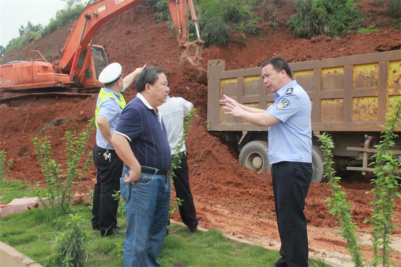 4月14日上午,藤县安监局局长叶梧、县公安局党委副书记、纪委书记甘家科、县安监局副局长陈泽雄在交管大队副大队长欧文海等陪同下,到塘步镇古祀路口塌方路段现场指导清理路面土方及安全监督工作。
