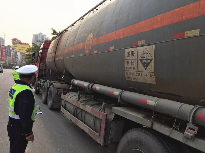 为确保清明期间道路交通安全,龙圩交警大队在辖区开展危化品车辆整治,严查危化品运输车辆交通违法行为,消除道路安全隐患,遏制危化品车辆重特大事故的发生。