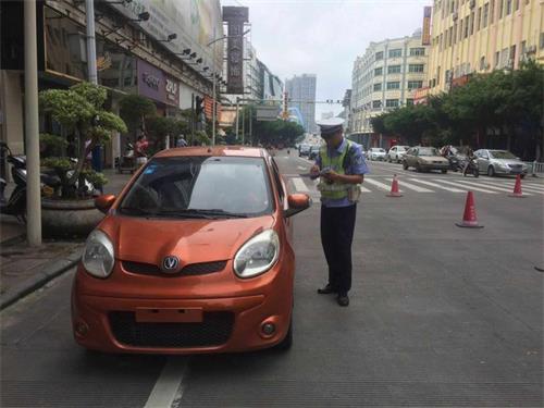 在西江路香港城对出路口,一名交警检查一辆未悬挂号牌的小车