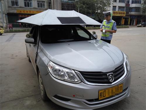 4月21日,岑溪市区十里长街路段出现一辆装有防热保护伞的教练车来回行驶,由于该车外观奇特,非常吸睛。巡逻交警发现后当场“叫停”,并对其进行教育和纠正。