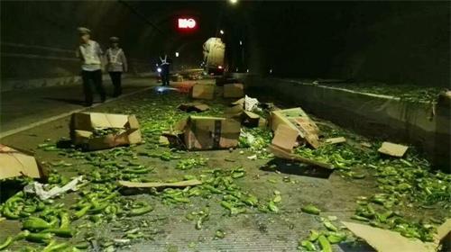 民警第一时间赶到现场看到,一辆挂着桂K车牌的重型大货车撞上隧道里面的右侧台阶,且车辆驾驶位前轮钢铀损坏严重且变形,车辆及散落的青椒堵塞右侧通道,造成隧道内仅剩左侧单通道通行,所幸的是无人员伤亡。