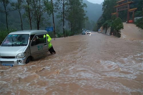 5月6日,蒙山县遭受今年入夏以来特大洪水袭击,国道321线等主要道路塌方出现险情,县公安、全体民警奔赴抗洪抢险第一线,疏导交通,跳进滔滔洪水推车,抢救财物。