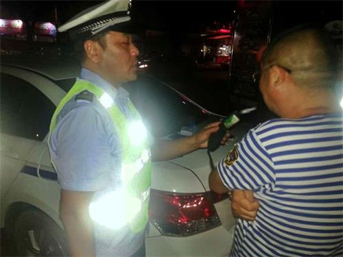 民警对驾驶员进行酒精测试