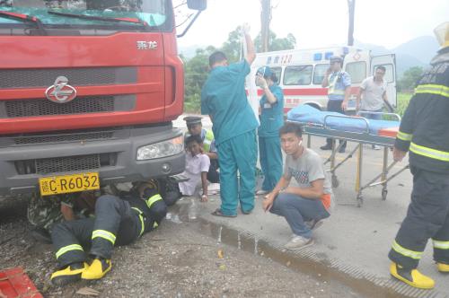5月30日上午,蒙山交警大队外勤中队民警潘国平带领两名协警像往常一样巡逻在辖区的321国道线上,约11时10分,当巡逻至国道321线480KM+500M(蒙山县西河镇壬山路口路段)时,发现一起大货车与摩托车相撞的交通事故,事故现场可见摩托车驾驶员的双腿被大货车前轮死死压住,不断的发出痛苦呻吟声。