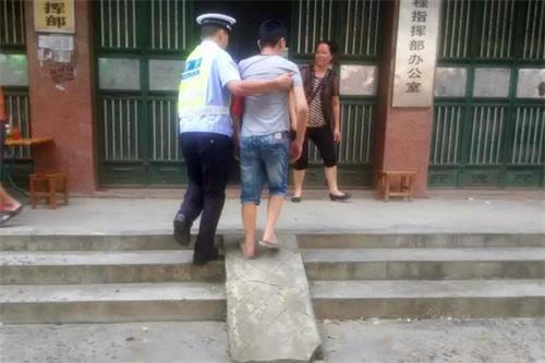 严警官搀扶着男子缓慢走向某工程指挥部的大门旁边