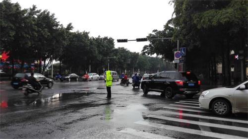 6月14日傍晚,梧州迎来了特大雷暴雨,强降雨使得路面能见度低,道路湿滑,给过往车辆和行人带来安全隐患,万秀交警大队迅速启动了恶劣天气交通管理工作预案,合理调配警力,加强道路交通指挥疏导工作,预防出现大面积拥堵和交通事故。