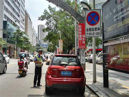 同时,大队加强辖区道路交通的静态管理,把整治城区车辆乱停乱摆工作当着提升群众满意度的一项重要工作来抓,要求各中队加强路面巡逻和高峰时段执勤力度,紧抓整治不放松,突出重点,发挥动力,明确主攻方向,把中山路、西江路、西堤路、新兴路、富民路等路段作为重点整治路段,并将整治触角延伸至阜民路、云盖路、蝶山路、工厂路等道路,争取不留整治死角。同时,大队还通过户外电子显示屏、“双微”平台等宣传方式,宣传车辆乱停乱摆的危害和交警整治乱停乱摆的措施,提醒广大驾驶人遵守交通法规,呼吁文明驾车、规范停车,做一名文明交通参与者,共同优化道路交通秩序。