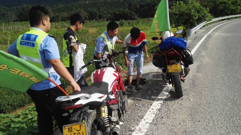 当日上午9时许,民警莫运欢带领黄村交警中队的一个巡逻组巡逻在国道321线上,当巡逻至黄村镇新开村同社桥路段时,发现两辆摩托车停在路边,地上躺着一名摩托车驾驶员,另有一名驾驶员不知所措的站在旁边。发现该情况后,巡逻民警立即停车设置安全警示标志,检查伤者情况,在得知伤者只是皮外伤时才放下心来。原来,这两名驾驶员是早上8时30分从蒙山县城出发,准备南下旅游的驴友,刚刚20出头,分别姓李和吴,当他们行驶至蒙山县黄村镇新开村同社桥路段时,李某因道路有浮沙,加上又是弯道,导致车辆失控、侧滑倒地。执勤民警见伤者李某并无大碍便将其引导到黄村镇卫生院进行简单的伤口处理,在叮嘱他们一些出行安全意识后便继续上路巡逻了。