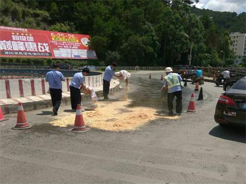 由于该转盘处路段车流量较大,若不快速清除油污带,过往车辆极易因轮胎打滑而引发道路交通事故。民警紧急向上级领导汇报相关情况,立即启动突发事件应急预案,将执勤人员分为两个小组:一方面安排警力放置反光锥筒对油污倾洒的车道进行封闭,指挥车辆驶入其他车道顺序通行,并提醒过往车辆注意小心慢行;另一方面为清除路面油污,避免滑摔事故再次发生,万秀交警系列了万秀区城监部门,并找来了扫帚,用麻袋装来碎木屑,一点点覆盖在油污上。