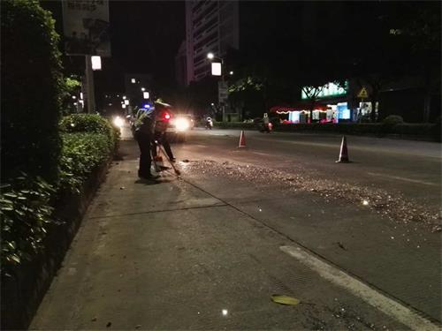 29日零时许,万秀交警值班室接群众报:在西环路万秀法院对开道路上有很多玻璃碎洒落路面,影响道路交通安全。接报后,大队民警马上驱车赶往西环路,西环路为辖区交通流量较大的路段,过往车辆密集,大量玻璃碎片占去该道路的一条车道,存在严重的道路交通安全隐患。民警立刻意识到,必须快速清除这些玻璃碎片清除,否则将影响过往车辆的行车安全。