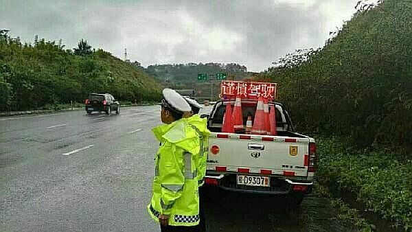 7月4日中午开始,由于受偏南气流和弱冷空气共同影响,根据梧州市气象局发布的暴雨红色预警,并出现持续强降雨,为确保辖区高速行车安全,梧州交警支队高速一、二、五合署大队以压事故,保安全、保畅通为主,迅速采取应对措施,深入路面一线,加强暴雨天气下高速行车安全提示和管控,有效保障恶劣天气下辖区高速行车安全。