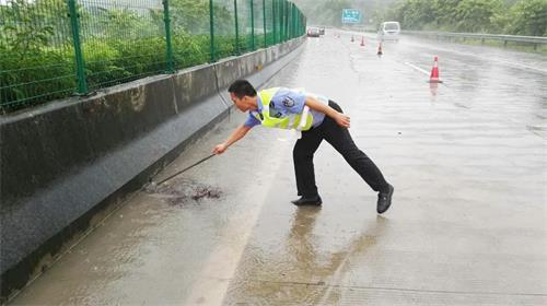 18时许大队执勤民警在巡逻至广昆高速278公里处发现一小车因路面积水而发生的自身交通事故,执勤民警迅速在事故车辆周边合理摆放锥筒,并询问得知车辆人员并无受伤,在等待救援维修车辆到来之时,执勤民警发现该路段因排水口遭杂物堵塞而引发积水,为防止同类事故再度发生,同行协警立刻冒雨清理杂物,及时消除路面积水隐患,在20分钟后救援拖车到达,这起轻微事故得到了妥善处理。