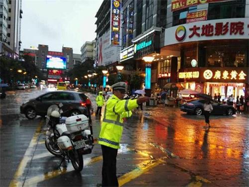 7月4日傍晚17时许,梧州市突降暴雨,导致辖内中心城区部分路段发生内涝,严重影响道路交通安全。万秀交警大队积极作为,马上启动恶劣天气交通应急预案,做好暴雨中的引路人,指挥疏导过往车辆,排查各类交通安全隐患,护卫群众安全回家。