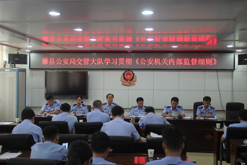 覃娜副教导员通全体警员学习了《藤县公安机关内部监督细则》文件精神,语重心长、详细地分析了该文件,互相勉励监督。朱名杰大队长总结了李教导员、覃副教导员的重要讲话,强调了各中队长把此次会议精神传达到每个民警;强调了队伍建设需要继续加强;总结了近段大队开展工作取得成效,再接再厉;并详细部署了大队下半年工作;尤其是当晚的县局组织的“神剑”车辆查缉整治统一行动工作部署并落实,为当晚取得整治成效鼓起加油。