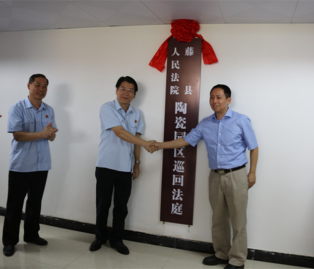 7月13日上午,藤县法院陶瓷园区巡回法庭在藤县中和陶瓷园区内的管委会办公大楼挂牌成立。梧州中院党组书记滕志华、藤县县委书记黄东明、梧州中院党组副书记、副院长黄炳雄、藤县县委常委、政法委书记何勇翔等人出席挂牌仪式并参加座谈会,仪式由藤县法院党组书记、院长石忠贵主持。
