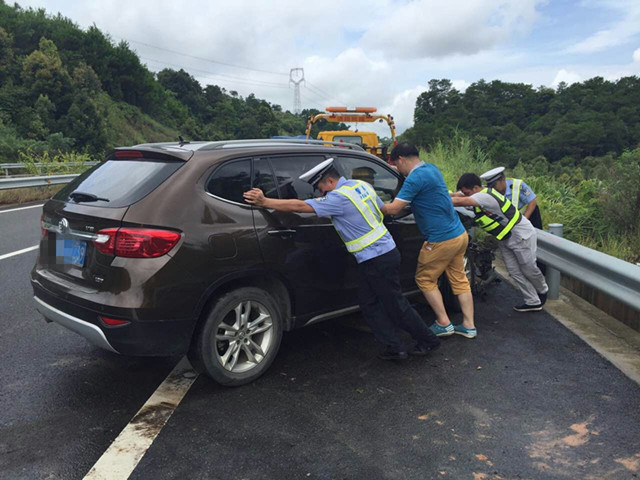 民警接警后迅速前往事故现场,当民警到达现场发现一辆华晨中华小车停靠在应急车道以及慢车道上,小车车头严重受损。民警立即分工,在来车方向摆放反光锥筒,提示过往车辆前方有事故,减速慢行;并派一警员在反光锥筒后面指挥过往车辆,安全通过。在民警的有序的指挥下,事故现场并没有发生交通堵塞,拯救车队在11时21分到达现场。经过民警及拯救车队的努力下,在12时15分处理完毕。