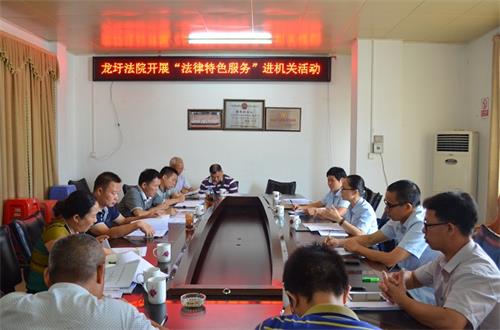 为加强法院与行政机关的联系沟通,增强行政机关干部的法治观念和执法能力,促进行政机关依法行政,2016年7月19日下午,龙圩区法院副院长马华炎带领该院行政庭全体干警深入龙圩区新地镇政府,开展法律特色服务进机关活动,深入推进“特色司法服务月”活动,受到了机关干部的一致欢迎和好评。