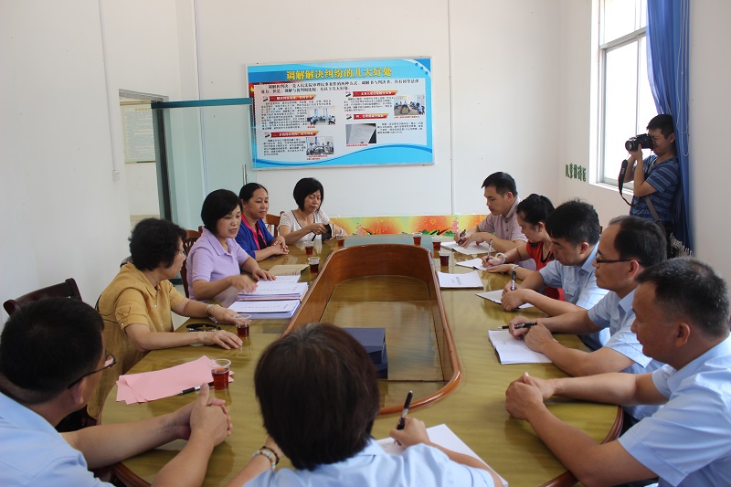 视察后,伍副主席一行与法官进行了座谈。龙圩区法院副院长关坚代表法院汇报了龙圩区法院特别是大坡法庭“妇女儿童维权岗”创建工作的情况。关副院长指出,龙圩法院自成立以来高度重视妇女儿童维权工作,充分发挥审判职能,依法高效维护妇女儿童权益。通过对妇女儿童维权案件开辟“绿色诉讼通道”,推行快立案、快送达、快调解、快审理、快执行的“五快”工作模式,在未成年审判以及婚姻家庭案件中引入心理专家介入矫正工作机制,促进未成年人顺利回归社会,帮助当事人修复或重建婚姻家庭关系。结合当前全区法院开展的家事审判方式改革,龙圩区法院、大坡法庭将与其他民商事审判业务庭一样,积极与当地妇联等单位联系,共同探讨维护妇女儿童权益的新途径。