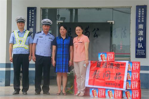 慰问组为南渡中队的民警和协警送去饮料、白糖、绿豆等消暑解热物品,感谢他们为维护岑溪交通稳定所做出的贡献,希望他们好好保重身体,安全度夏。