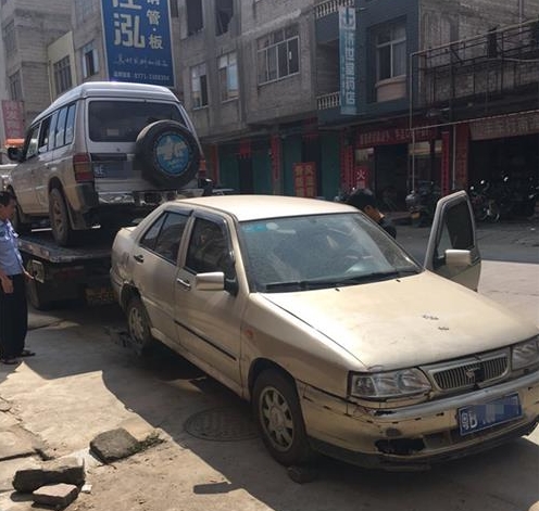 南渡中队民警赶到现场时,一辆白色的小型桥车停放在南渡镇主要街道上,还贴有类似广告的海报传单。民警即刻对该车辆悬挂牌号和车架号进行比信息对后,确定该车是一辆套牌车。民警在对车辆检查过程中,发时车辆破旧不堪、车内一片狼籍,还发现了该车后备箱里藏有管制刀具等违禁物品。中队民警依法暂扣该车辆,并即叫来拖车将其拖走。