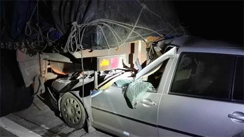 民警赶到事故现场后,首先做好事故现场的安全防护及警戒,并安排一组警力在事故后方摆设警示锥筒,指挥过往车辆有序通行。经现场初步勘察和询问得知:一辆银色小轿车嵌进了一辆红色大挂车的尾部,小轿车被撞得面目全非,红色大挂车尾部造成轻微轻微,银色小车前保险杠断裂、挡风玻璃破碎、水箱变形。小轿车内的安全气囊都被弹出,车内血迹斑斑,主驾驶一男子鲜血染红了身上的白衫,事故发生后,120救护车也随即到达了现场,将小轿车驾驶员送往医院救治。