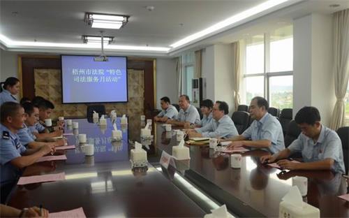 “八一”建军节来临前夕,万秀区人民法院副院长黄秋红带领审监庭干警,跟随梧州市中级人民法院副院长廖克东带领的中院审监庭干警一行9人,来到梧州市武装警察部队驻监狱中队开展“特色司法服务月”活动之 “法律特色服务进军营”活动。