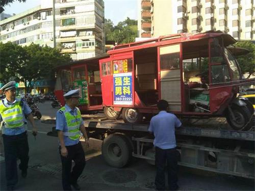 下午16时,专项行动组在军区岗,主要针对三轮车进行整治,对三轮车非法拼装或达到报废标准不及时报废、三轮车未悬挂号牌、擅自改变机动车外形和已登记的有关技术数据、无证驾驶、非法载客等这几类违法行为进行重点查处。行动小组通过见违必纠,在检查的同时加强对广大群众的宣传,告知乘坐三轮车存在的危害性,对进行非法营运载客的三轮车依法予以暂扣。