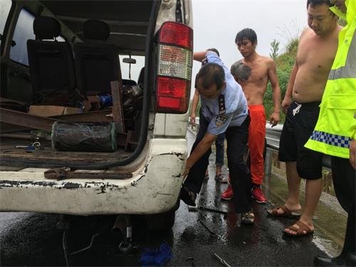 8月2日下午,辖区高速路段下着小到中雨,梧州交警支队高速一、二、五合署大队民警加强了路面巡逻排查,当巡逻排查到贵梧高速22公里处(藤县往贵港方向),发现一辆广东牌照的面包车打着双闪灯停在应急车道,几名男子在车旁正弯腰检查着轮胎,故障车辆周边没有设置安全防护标识。经询问得知,该部面包车后轮爆胎导致不能行驶,而驾驶员和车上乘客均不会换轮胎。了解情况后,民警迅速在故障车辆后面做好安全防护措施,指挥后面来车注意减速慢行,年近6旬的张志华警官冒着风雨为爆胎司机换轮胎,任凭风雨拍打着身子,雨水很快浸湿了张警官的衣服,张警官顾不上擦一下身上的雨水,用了10多分钟便为司机换好了轮胎。