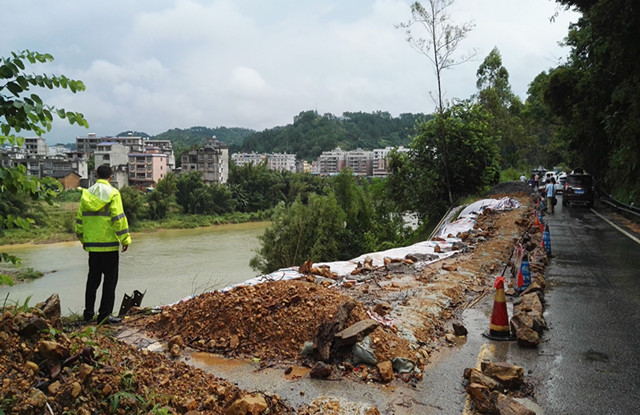 今年第4号台风“妮妲”于8月2日下午从梧州至贺州一带进入广西境内,梧州市迎来了一场狂风暴雨。蒙山县气象台3日凌晨发布暴雨黄色预警,蒙山雨势由弱变强。强降雨给辖区道路交通安全带来了较大压力,特别是国道321线陈塘镇石燕山塌方路段。为了做好强台风期间道路交通安全管理工作,蒙山交警不顾风雨坚守岗位,日夜兼程对辖区国省道开展巡逻排查工作,重点加强陈塘石燕山塌方路段的管控,确保辖区道路安全畅通。