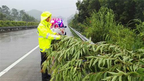 下午5时,辖区G65包茂高速岑溪段及G80广昆高速岑溪段降下暴雨,大队迅速启动应急勤务模式,全警动员备战,一组巡逻人员在糯垌往岑溪方向发现一棵大树被台风刮倒侧翻在应急车道上,严重影响过往车辆行驶安全,巡逻人员立刻下车冒着狂风暴雨将树慢慢挪出高速公路外。
