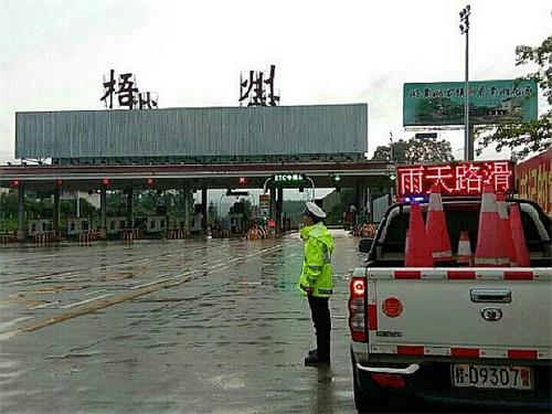 二是在暴雨前夕,组织警力在大坡桂东收费站、梧州收费站、苍梧收费站、新地收费站、藤县收费站等高速入口,对进入高速的司机进行安全提示和提醒,劝导司机减速慢行,做到安全行车。