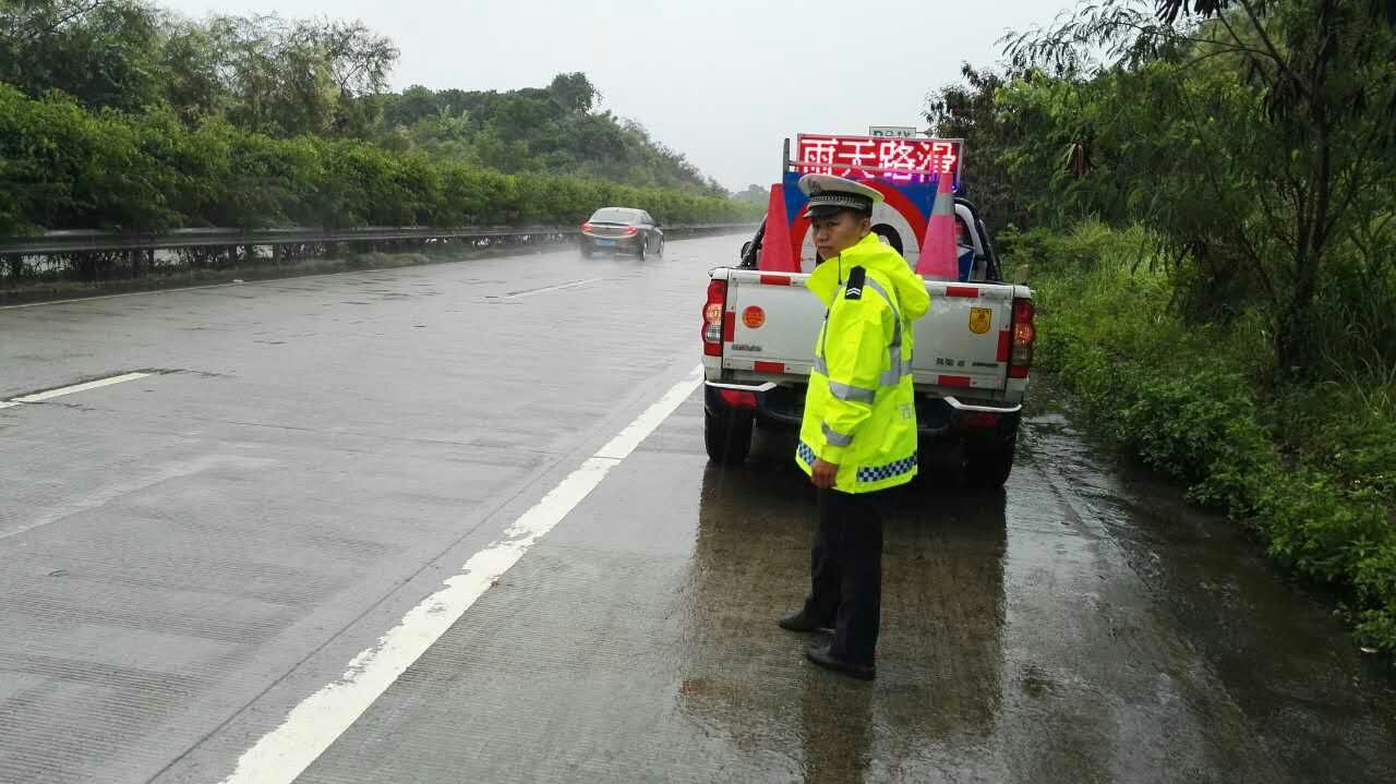 路面上暴雨如注,将民警、协警们的衣服全部淋湿,皮鞋也灌满了水,但丝毫没有动摇执勤人员守卫路面安全的决心。暴雨中民警、协警尽职尽责,不断通过电子显示牌、高音喇叭及交通手势提醒过往驾驶人注意雨中行车安全,减速行驶,另一方面也在微博上将辖区路况及时发布。用实际行动保障了暴雨天气下辖区内道路的安全畅通。