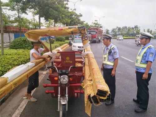 本次整治行动,大队在采取定点和流动的方式在新兴三路凯莱路口、西堤三路沿线开展整治行动的同时,还结合天网监控、高峰岗点执勤的形式铺开“天罗地网”,对违法三轮车实行多角度、多路段的全方位整治。执勤民警对电动三轮车实施“零容忍”的工作原则,对电动三轮车无牌无证、无证驾驶、违反禁令标志、超员超载、未随车携带保险标志等交通违法行为的重点予以查纠、整治。8月12日早上,大队在三龙大道开展交通违法行为整治行动时,查处了一辆超长超宽运输的无牌电动三轮车。民警所见在这里电动三轮车后车厢中运输的不锈钢货物早超出了车身长度,在车里前后位置超出了将近2米的距离。执勤民警立即将其引导至安全地带,还耐心向驾驶员讲解相关法律法规,并责令其立即将超限货运进行转运,提醒其上路驾驶一定要遵守各项交通安全法律法规,保障自己和他人的交通安全。