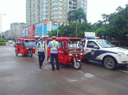 为稳步推进夏季交通安全专项整治行动,进一步给广大市民出行创建一个良好的交通秩序环境,切实加强三轮车违法载人、拉客的违法行为整治,营造安全和谐的道路交通氛围,确保广大人民群众出行交通安全、畅通,龙圩交警大队想法设法不等不靠主动出击,结合城区道路交通实际,在辖区内开展为期三轮车集中整治行动,严查三轮车交通违法行为。