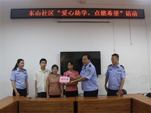 8月26日下午,教导员带队深入到东山社区,将筹集到的现金送到一对梁姓姐弟手中,用爱心照亮其前进的道路。据了解,姐弟俩的父亲是环卫工人,而母亲刚从事家政服务,家中的收入不高,姐姐刚考进广西一所高校,弟弟也是刚就读高中,本就不富裕的家庭要支付两个孩子的学费,经济很是窘迫。面对着这沉甸甸的爱心捐款,姐弟俩纷纷表示,“会满怀感恩之心,努力学习,报效祖国,不负警察叔叔们的殷切希望!”