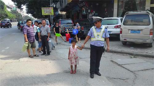 2016年8月30日,龙圩交警大队执勤民警在辖区林水小学周边巡逻时,发现一名小女孩迷了路,不知道该怎么回家,执勤民警经过询问调查后,将这名迷路的小女孩送回亲人身边交给家人看护。