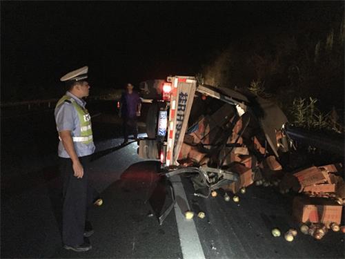 9月2日凌晨1时08分值班民警接到群众报警电话,在S40线苍硕高速梧州段16公里处一运载苹果的货车与护栏碰擦后侧翻,民警接警后迅速出警,到达现场后看到一辆轻型货车侧翻在路面,车辆附近一箱箱一只只苹果散落地面。这时民警迅速在事故现场周围摆好锥筒、事故警示牌和反光标识等安全防护措施,并指挥过往车辆慢行有序通过,预防二次事故发生。并派出警员在反光锥筒后面指挥过往车辆安全通过。