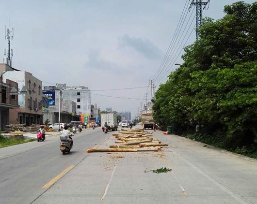 9月7日中午,一低速自卸车所载木材因超载捆扎不牢,散落在国道324线岑溪市探花中石化加油站路段的主干线上,所幸岑溪市交通管理大队归义中队民警巡逻至此,及时处置,未造成事故安全隐患。