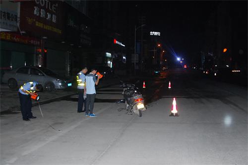 9日凌晨2时许,一辆二轮摩托车从思湖路往玉梧大道方向行驶,将要行驶至红绿灯路口时,一辆小轿车从玉梧大道右转弯进入思湖路,小轿车转弯后驶过道路左侧逆行,车头左前方与摩托车发生碰撞,摩托车上两人随即摔倒在一旁,而小轿车将摩托车一路推行几十米后,摩托车与小轿车脱离,随后小轿车驾驶人并没有停车,驾车径直逃离现场。岑溪交管大队负责处理事故的民警们接到报警电话后立即赶到事故现场,摩托车方受伤的两人被赶到的120救护车送往医院治疗,民警随后展开勘察工作,并通过微博和微信等网络平台发布信息,10日上午,肇事男子迫于压力来到岑溪交管大队自首。